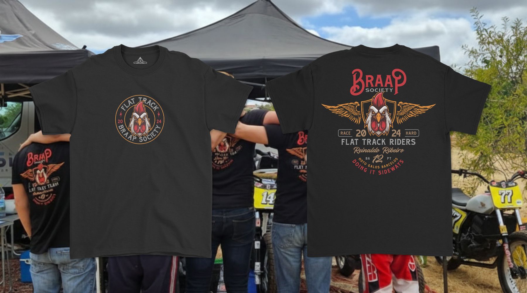 MOTO GALOS BARCELOS – Mais do que um clube, é uma instituição do motociclismo em Portugal. Para a época de 2024 do Campeonato Nacional de Flat Track, o desafio não era para um "cliente", mas para amigos da casa. O objetivo era vestir a equipa (especificamente o piloto Reinaldo Ribeiro #12) com uma imagem que respeitasse a origem (Barcelos) mas respirasse a poeira e a adrenalina das pistas de terra.