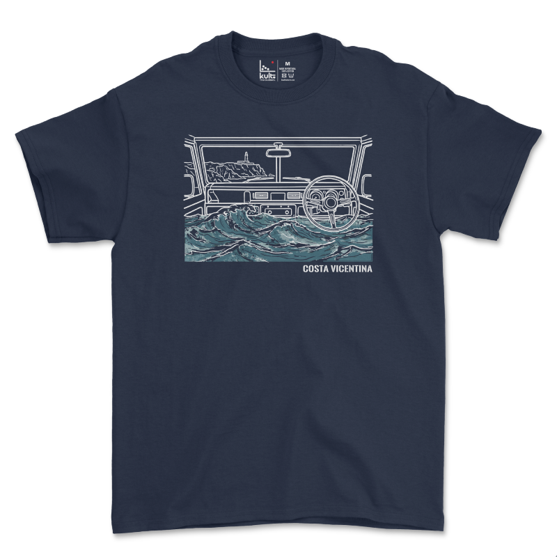 Este design coloca-te no lugar do condutor. A ilustração captura a perspetiva do cockpit de um Defender clássico, olhando para o icónico Farol do Cabo de São Vicente, enquanto o Atlântico "inunda" a vista. É a representação perfeita da "road trip" de surf e aventura, de Sines a Sagres, sempre com o mar por companhia.