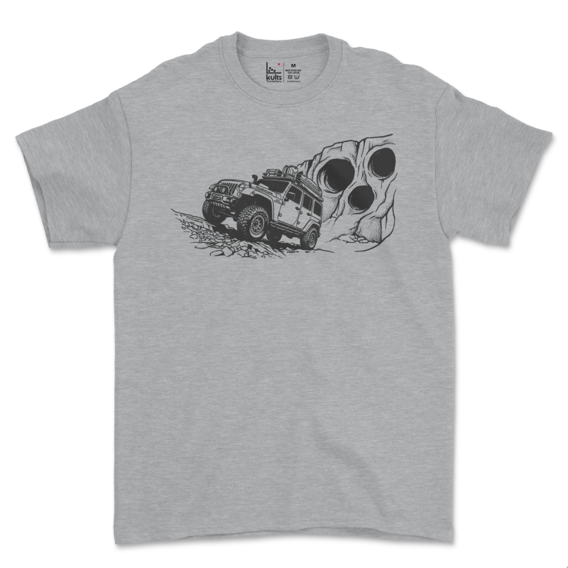Este design capta a escala monumental do Vale das Buracas. A ilustração destaca a verticalidade das paredes de calcário face à robustez de um 4x4 em progressão técnica. É o tributo perfeito às rotas de pedra do Centro de Portugal, onde a tração é testada a cada metro.