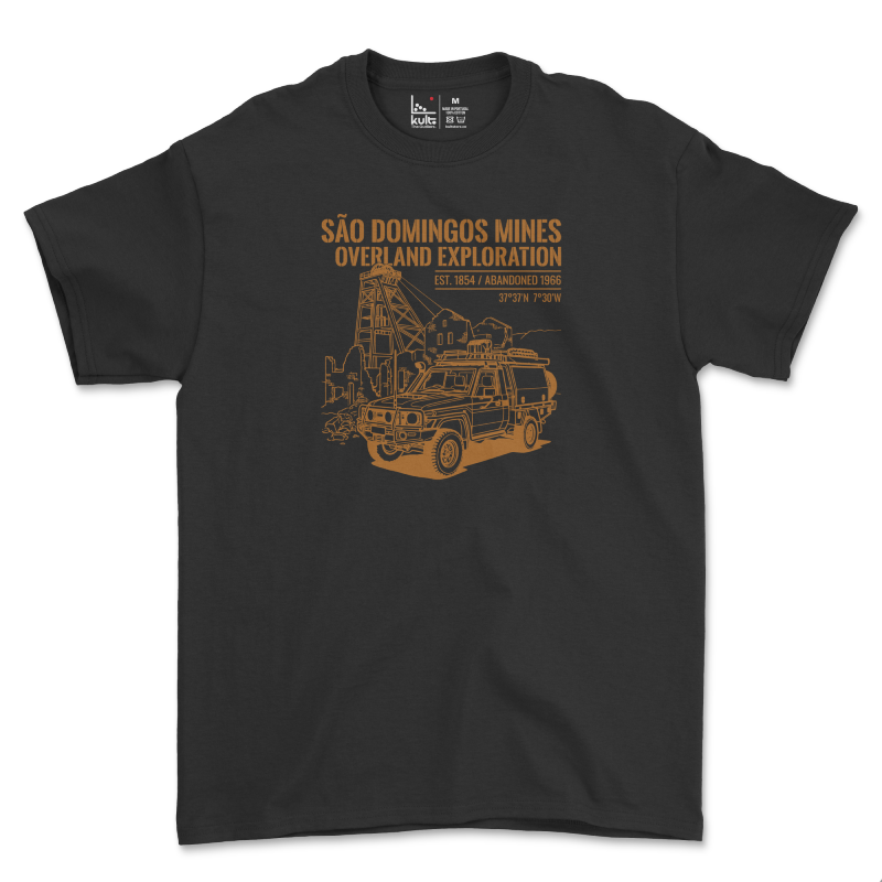 Esta t-shirt captura a essência crua desse cenário pós-industrial. O design, estampado na cor do minério oxidado (copper/rust), destaca o "esqueleto" das antigas estruturas de extração que ainda vigiam a paisagem. Em primeiro plano, uma máquina feita para o trabalho duro — um Land Cruiser Série 79 preparado para expedição — simboliza o meio ideal para explorar estas coordenadas históricas (37°37'N 7°30'W).